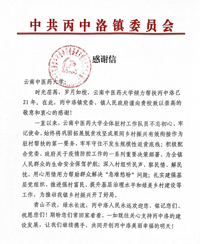 信中提到,云南中医药大学全体驻村工作队员不忘初心、牢记使命,始终将巩固拓展脱贫攻坚成果同乡村振兴有效衔接作为驻村帮扶的第一要务,牢牢守住不发生规模性返贫底线,积极配合党委、政府关于疫情防控工作的一系列重要决策部署,为人民群众生命安全保驾护航;深入村组听民声、察民情、解民忧,用心用情用力帮助群众解决“急难愁盼”问题;扎实建强基层党组织、推进强村富民、提升基层治理水平和绿美乡村建设等工作,为推动全镇乡村振兴开了好局。工作队员主动融入社区,与社区两委通力合作、齐心协力,不畏艰难,不舍昼夜,走家串户听民意、访民情、纾民困、解民忧,积极落实各项惠民政策,在促进脱贫群众增收、改善人居环境、解决群众难题、提升班子战斗力方面成效显著。